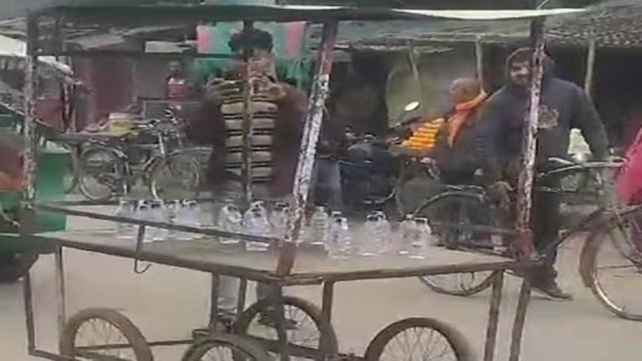 वीडियो में शराब बेचने का काम एक ठेले पर किया जा रहा है और ठेला चालक अपने ठेले पर सौफी शराब की बोतलों को सजा रखे हुआ है और बारी-बारी से लोग आकर पैसे दे रहे हैं और शराब को खरीद रहे हैं।