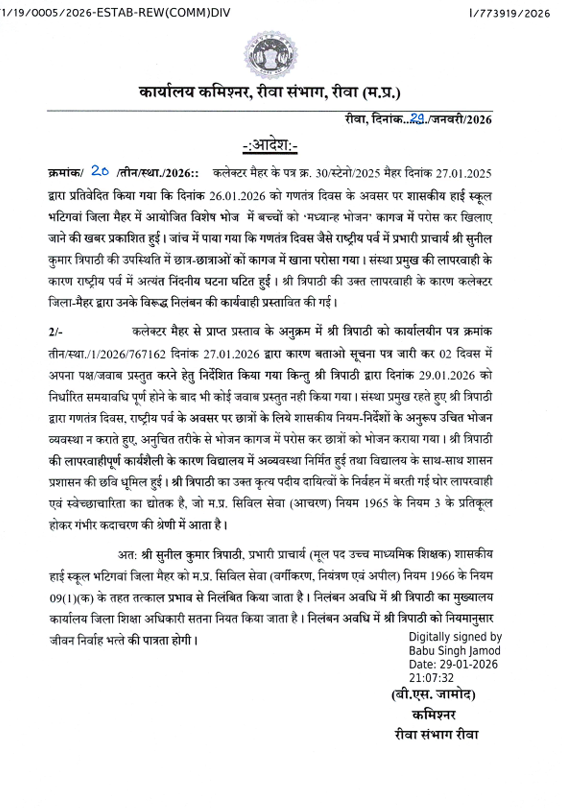 रीवा संभाग के कमिश्नर बी.एस. जामोद ने इस संबंध में निलंबन आदेश जारी किया है।