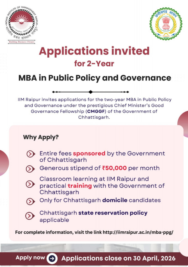 यह फेलोशिप विशेष रूप से छत्तीसगढ़ के मूल निवासियों के लिए उपलब्ध है तथा इसमें राज्य शासन की आरक्षण नीति लागू होगी। इच्छुक अभ्यर्थी विस्तृत जानकारी एवं आवेदन के लिए IIM रायपुर की आधिकारिक वेबसाइट पर निर्धारित तिथि तक आवेदन कर सकते हैं।