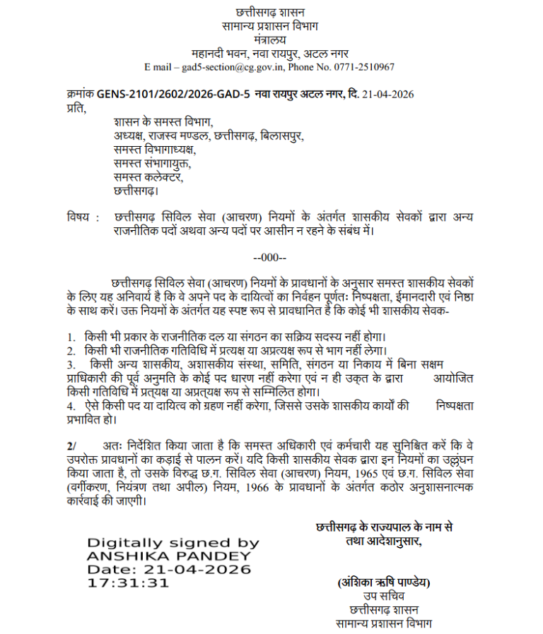 छत्तीसगढ़ सरकार का यह आदेश सरकारी कर्मचारियों की निष्पक्षता और राजनीतिक तटस्थता बनाए रखने के लिए काफी अहम माना जा रहा है। इसे आसान भाषा में विस्तार से समझते हैं 👇